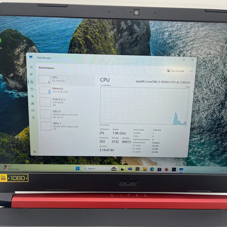 Soar to new gaming heights—anytime, anywhere—with the Nitro 5. This ultra-cool machine is sure to catch your eye with its sleek, mobile design, 15.6” Full HD IPS Display, and a wide range of gaming-rich features to put you in total command of the action. Leveraging the power and speed of its 9th Gen Intel Core processor and high-performance NVIDIA GeForce GTX 1650 graphics—that’s driven by NVIDIA Turing architecture.