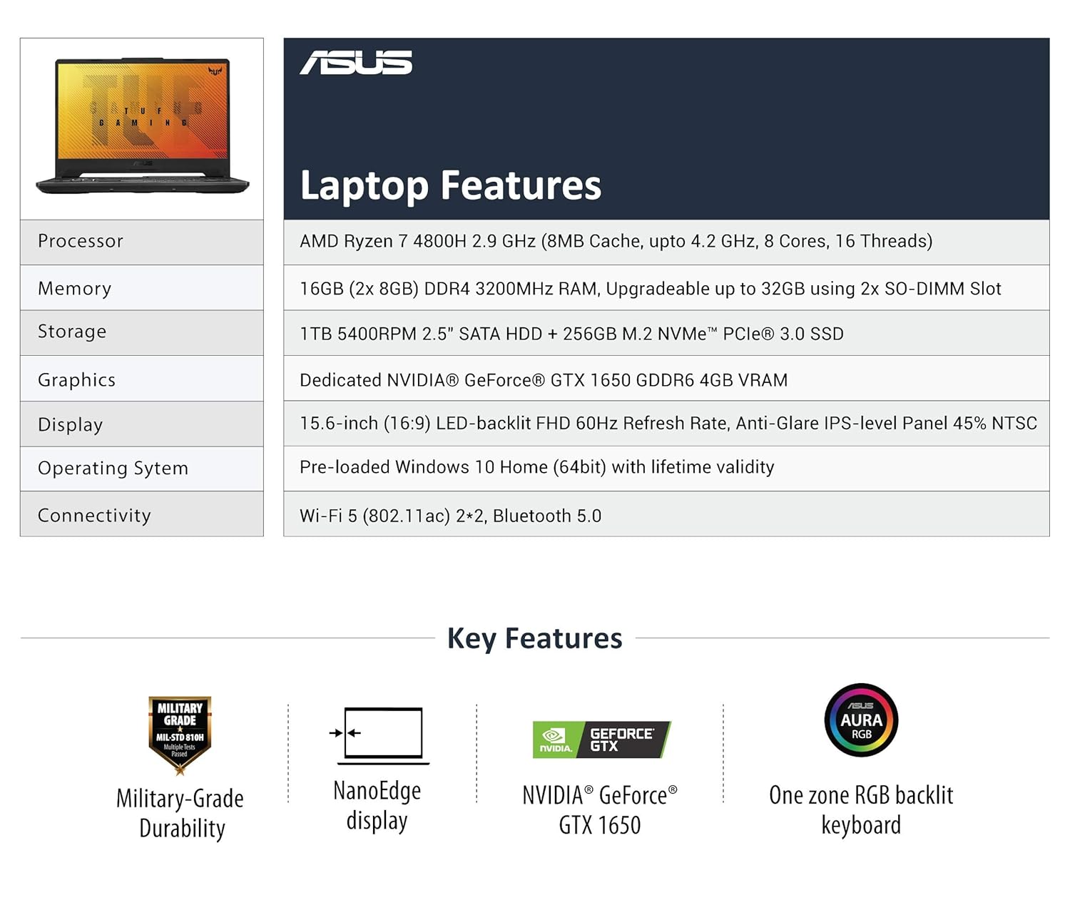 Product: ASUS TUF Gaming A15 15.6" Gaming Laptop AMD Ryzen 7-4800H @ 2.9GHz, 8 Corea (16GB RAM, 256 SSD + 1TB HDD) NVIDIA GEFORCE GTX 1650, RGB KEYBOARD, WINDOWS 11 (FA506I-BQ182T)